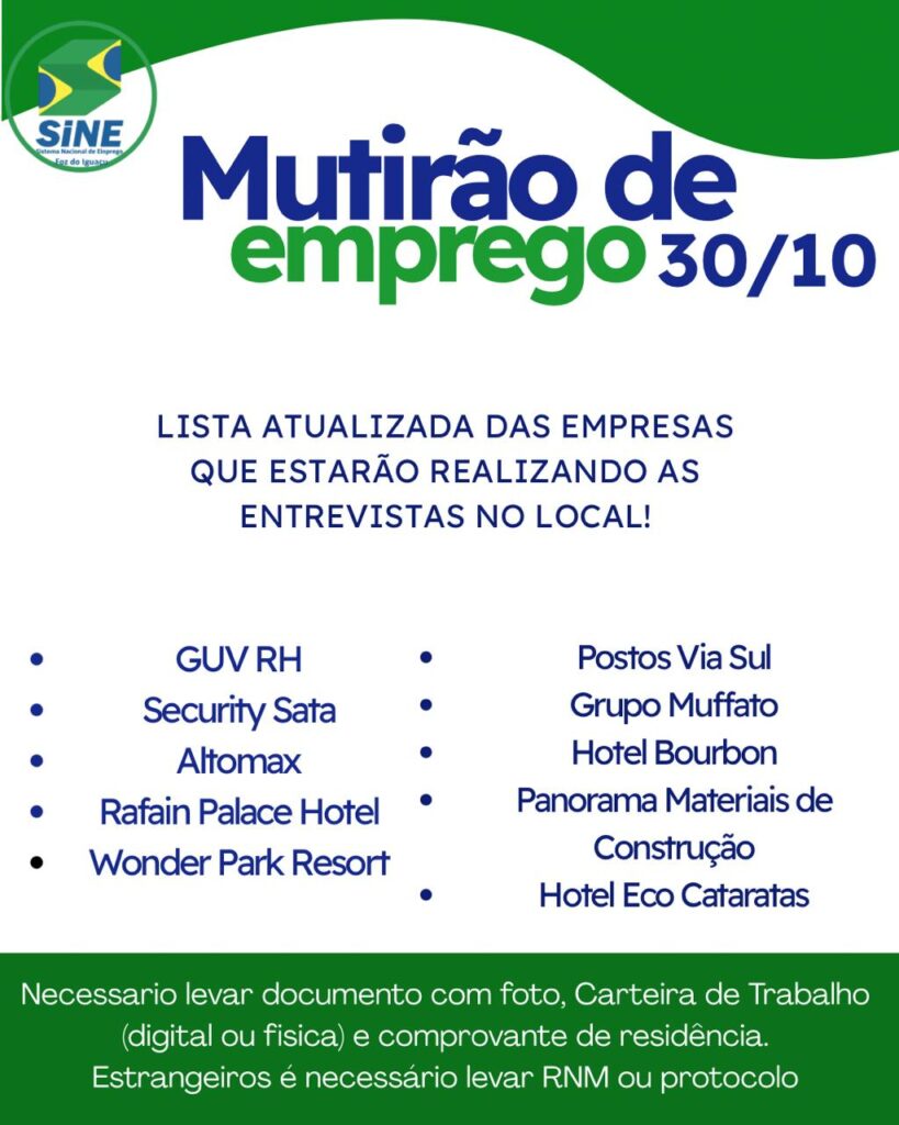 A Agência do Trabalhador de Foz do Iguaçu realiza, nesta quinta-feira (30), mais um grande mutirão de empregos, em parceria com a Faculdade Uniguaçu, na sede na Av. Felipe Wandscheer, 2435 – Vila Yolanda. O atendimento será das 8h às 12h.