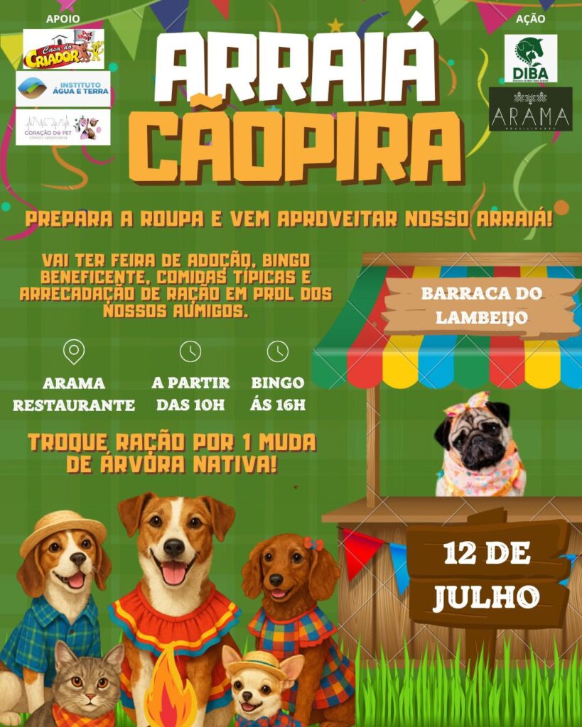 A Diretoria de Bem-Estar Animal (Diba), vinculada à Secretaria de Meio Ambiente, convida toda a população de Foz do Iguaçu para o Arraiá Cãopira, que acontece no próximo sábado (12), a partir das 10h, organizado em parceria com o Arama Restaurante.