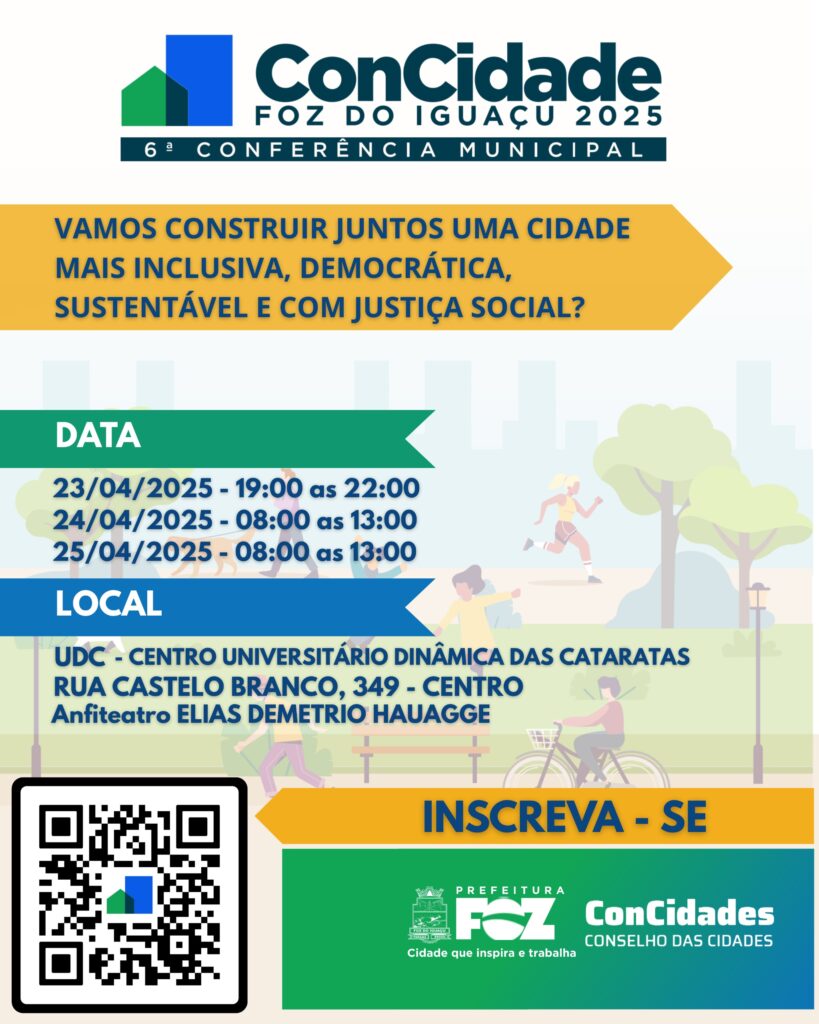 Ao final da conferência, também serão escolhidos os delegados que representarão Foz do Iguaçu na etapa estadual, garantindo voz ativa do município nas discussões sobre a política nacional de desenvolvimento urbano.