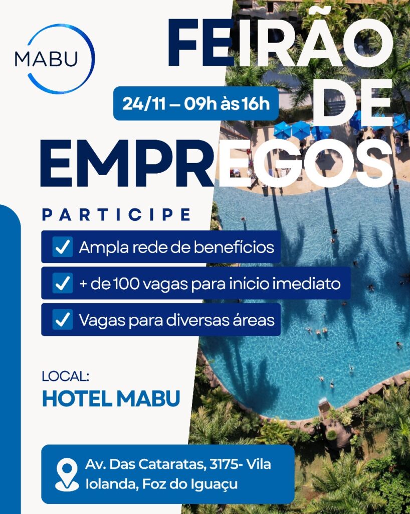 O Grupo Mabu realiza no dia 24 de novembro, às 9h, no Mabu Thermas Grand Resort, em Foz do Iguaçu, um Feirão de Empregos com mais de 100 vagas abertas em diferentes áreas: Vendas, Atendimento, Restaurante, Cozinha, Governança, Operações, Lazer e Administrativo. A iniciativa busca atrair talentos dispostos a crescer junto a um dos grupos que mais se expandem no setor de turismo e multipropriedade no Brasil.