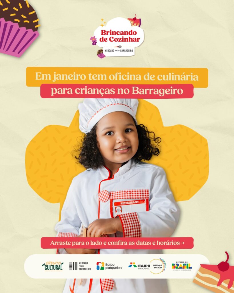 Durante o mês de janeiro, o Mercado Público Barrageiro realiza uma programação especial de oficinas de culinária voltadas para crianças, unindo aprendizado, criatividade e momentos de convivência em família. As atividades acontecem na cozinha do Mercado e propõem experiências práticas, lúdicas e afetivas, sempre com acompanhamento de um responsável.